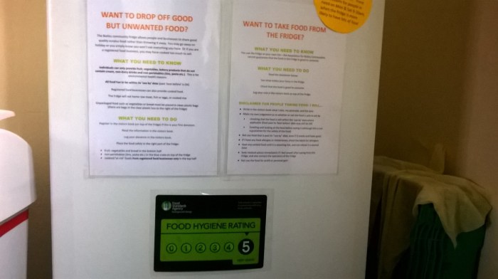 You may have found this site having seen the Botley community fridge on ITV or having heard about it on JackFM. This set of blogs talks about how the fridge was set up. Please click here to find out how the fridge works. We recently got a five star ranting from environmental health which we’re very proud of. Also consider ‘liking’ the community fridge’s Facebook page. Contact riki@phonecoop.coop or 07759 135811 if you want to know more.
